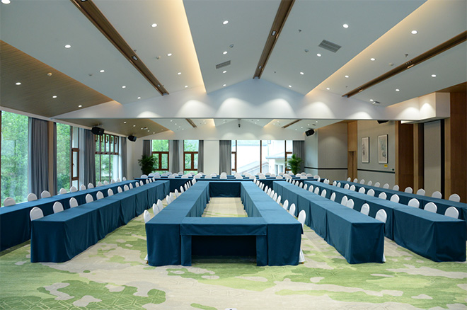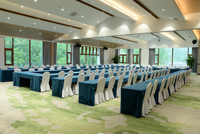 综合楼会议室总面积 600 ㎡ (长:26m、宽:15m、高: 3-5m)可容纳 150-400 人, 配套:LED屏 6*4m。
